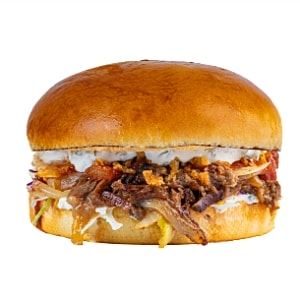 Много томленого мяса, приготовленного по особому рецепту, булочка, уникальный соус каймак, соус томатный по домашнему, хрустящий салат коул-слоу, жареный лучок.
