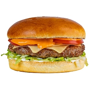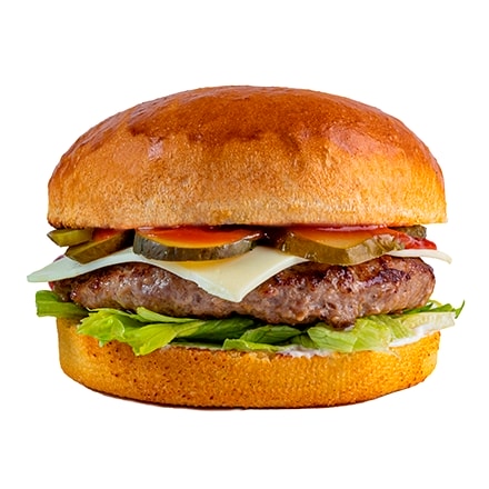 Уникальная булочка, майонез, сочный и хрустящий салат «Айсберг», 100% Казахстанская говядина без консервантов и усилителей вкуса, два сливочных ломтика сыра, маринованные огурчики и томатный кетчуп.