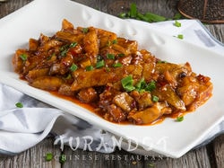 Очищенные баклажаны, нарезанные брусочками обжаренные с зелёным луком, чесноком, специями и приправами. 250 гр.